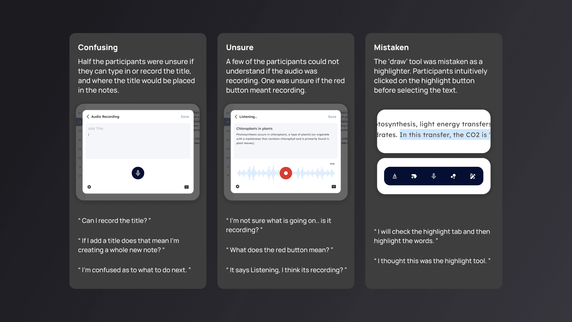 1. Dyslexics experience different levels of disability, so interviewing a spectrum of Dyslexics was helpful designing for accessibility. 2. Consider how visual representations, such as images, sketches and mind maps will be added and show up from the visuals tab.