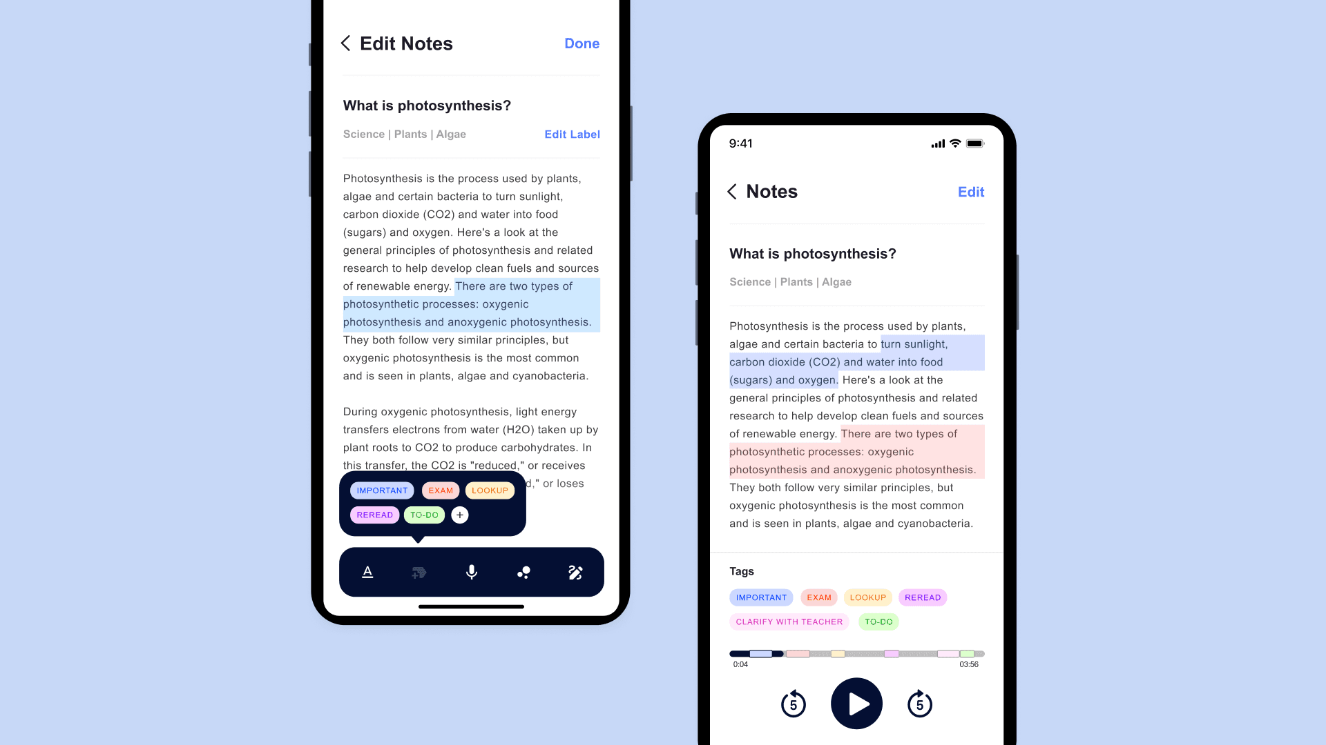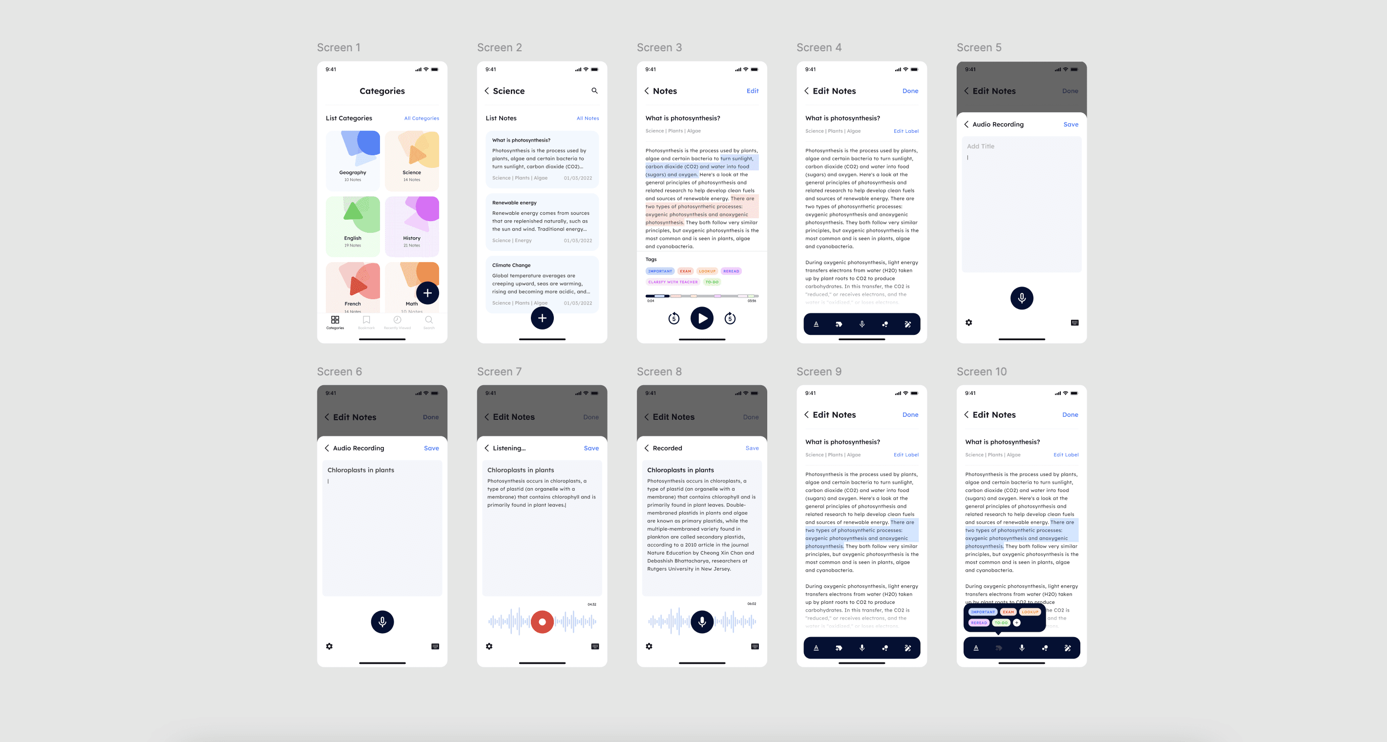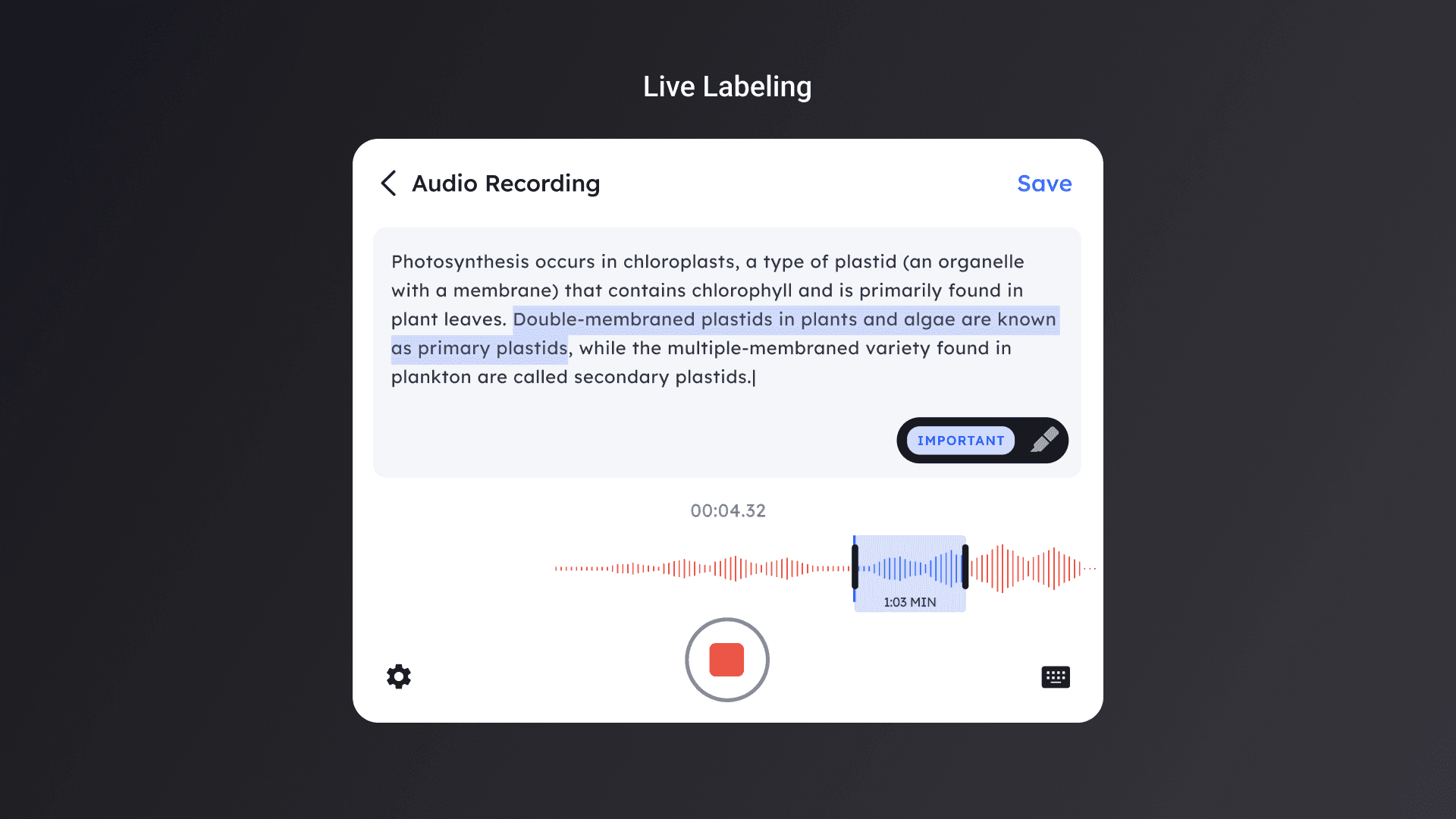 I iterated on my design based off the pain points from user testing. Many users also mentioned it would be helpful for them to make highlights while recording to get the important takeaways during lectures. I added this as an extra feature called Live Labels. The application lets students annotate and categories content without interrupting the live processing. The changes are then incorporated into the sound metadata.