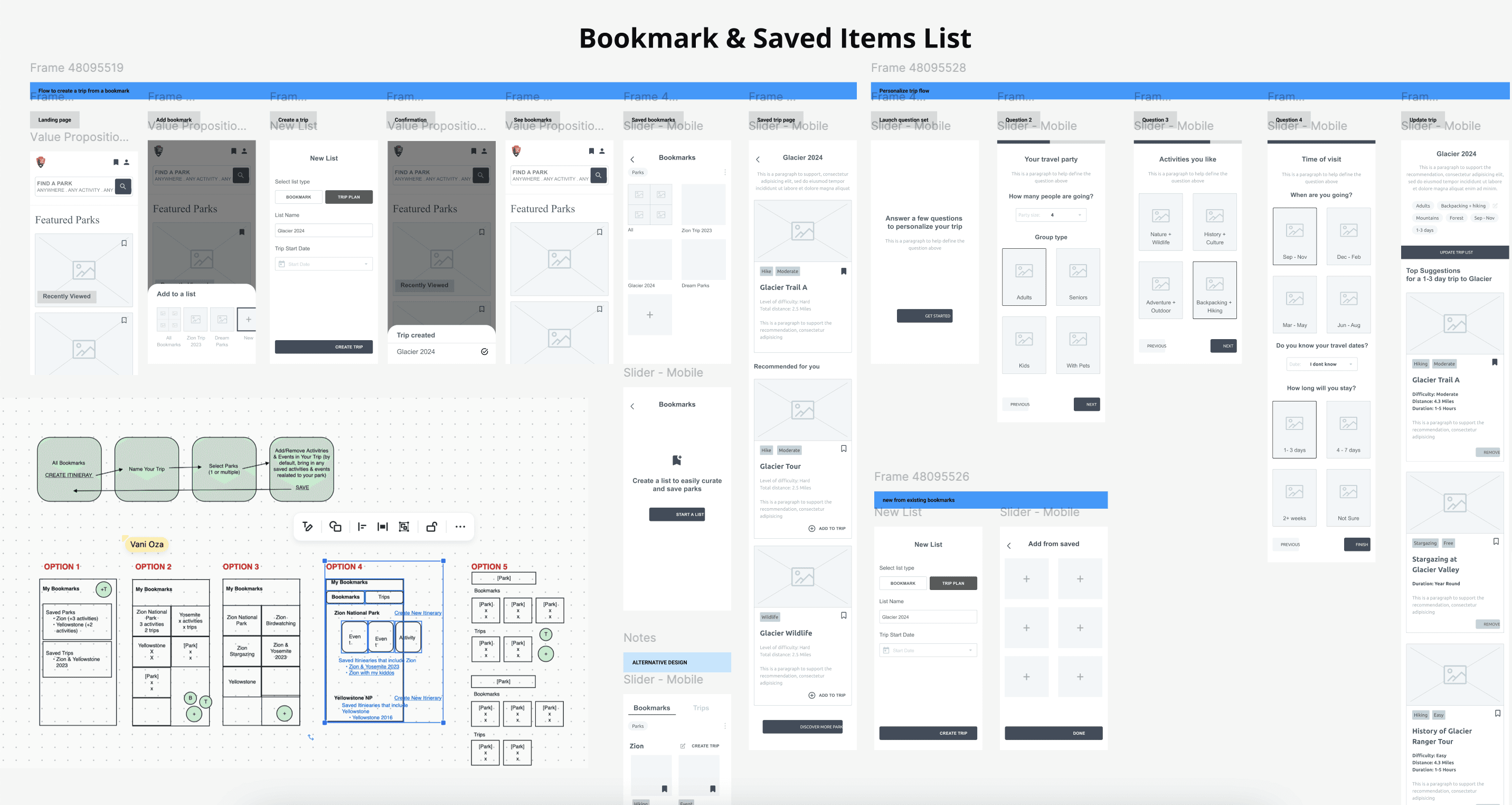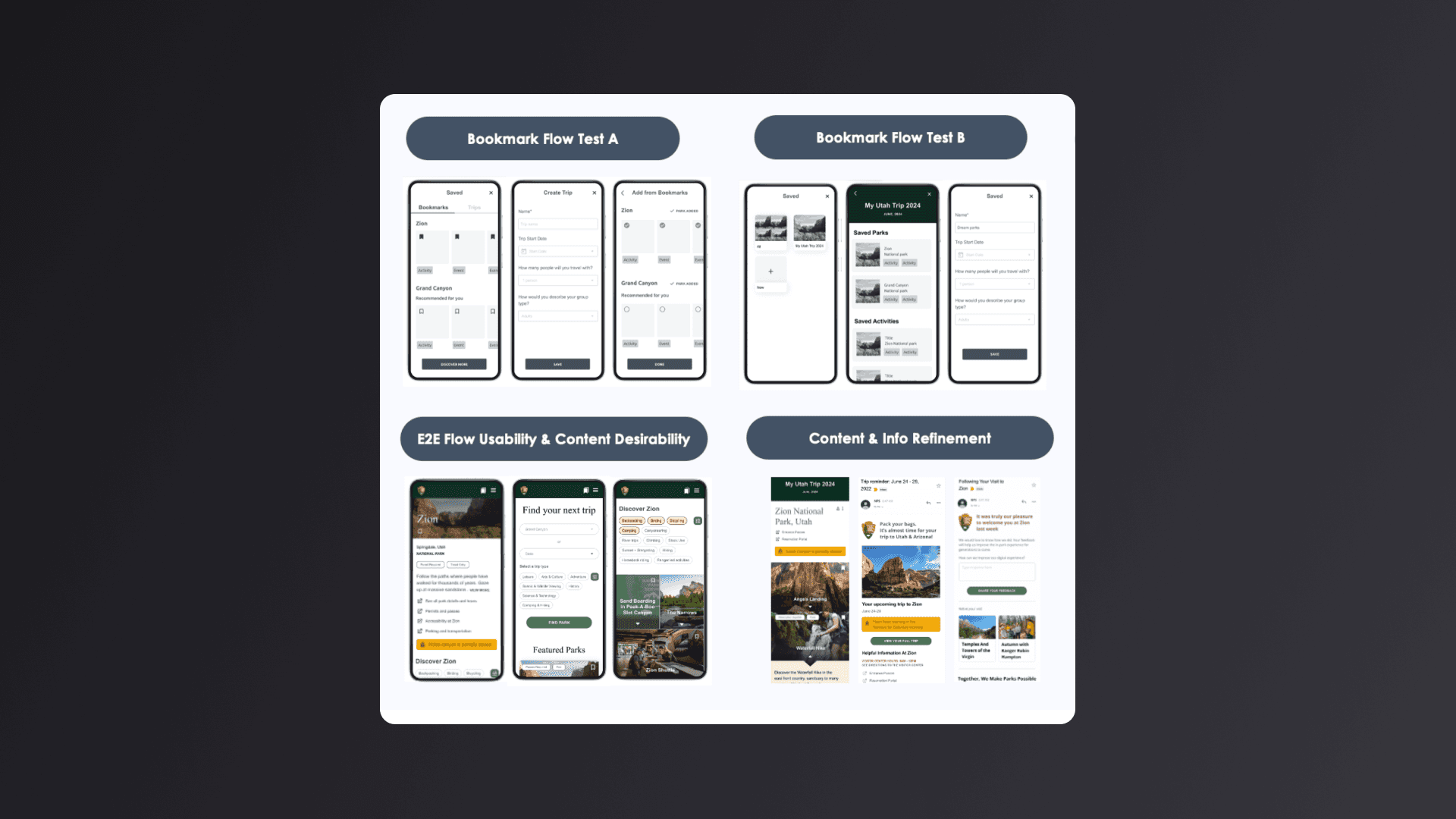 I tested the product at various stages of the project to assess MVP usability and content desirability Usability & Desirability Testing Goals: • Lo-fi prototypes - Assess functionality and interactivity for bookmarking flow • Unmoderated User Testing - Review usability of End-to-End flow • Beta Testing - Content and information refinement in trip planning, pre and post trip emails