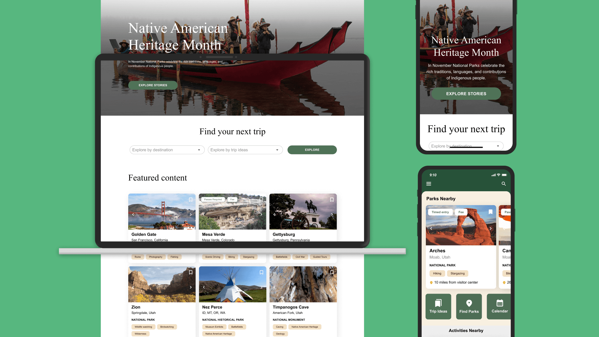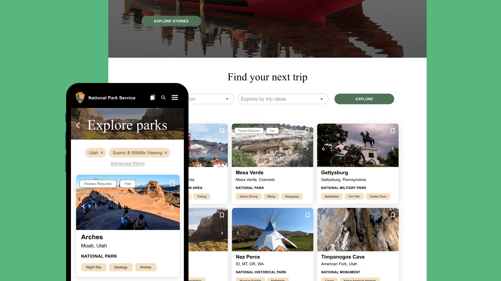 We created a welcoming content strategy supported by intuitive filtering options that place priority on relevant details. In the new design, visitors can easily save parks and activities they're interested in across both the NPS website and mobile app. By providing straightforward access to essential trip information, we help visitors confidently enjoy the planning process and set the stage for meaningful visits and future adventures.