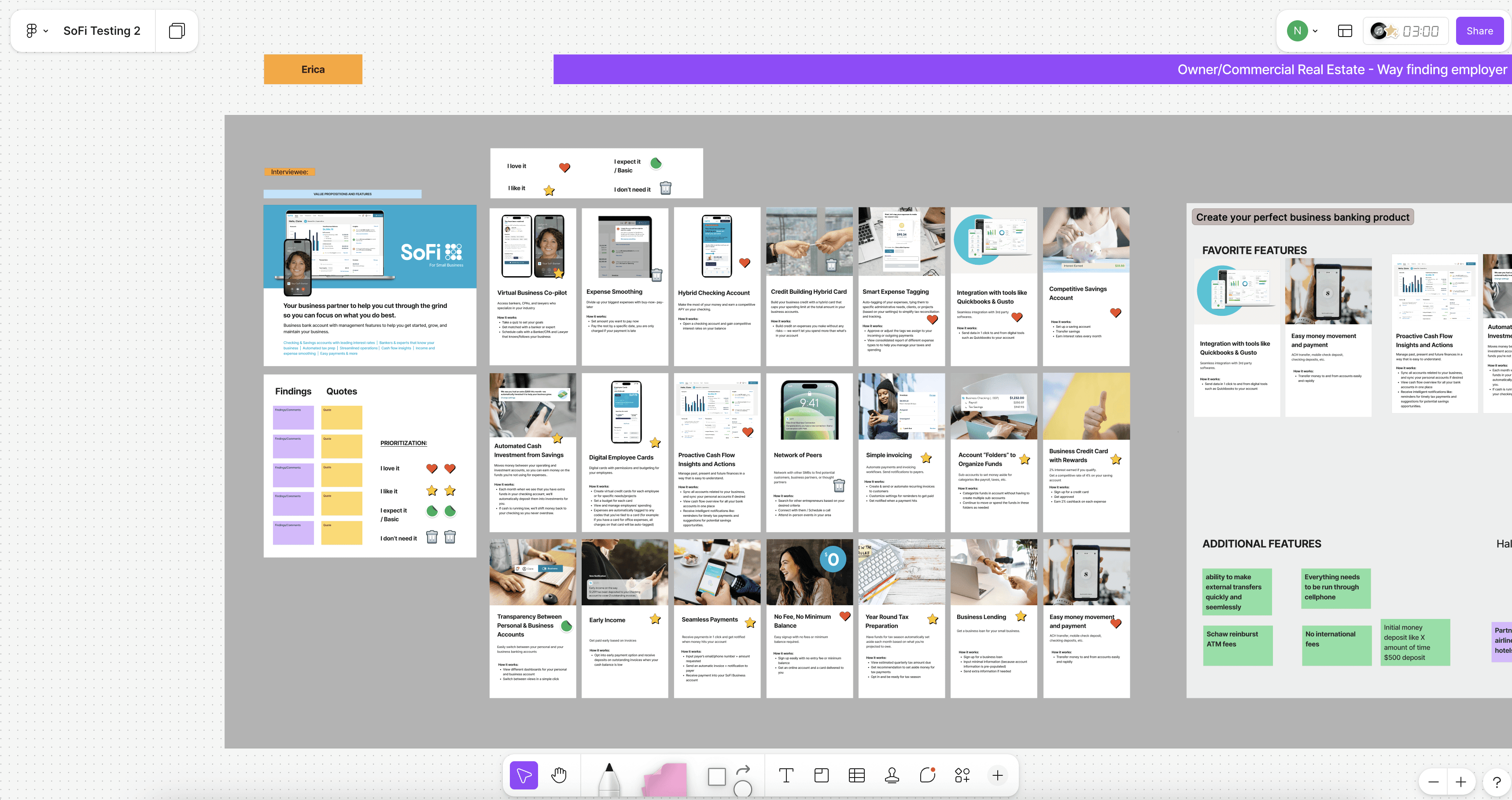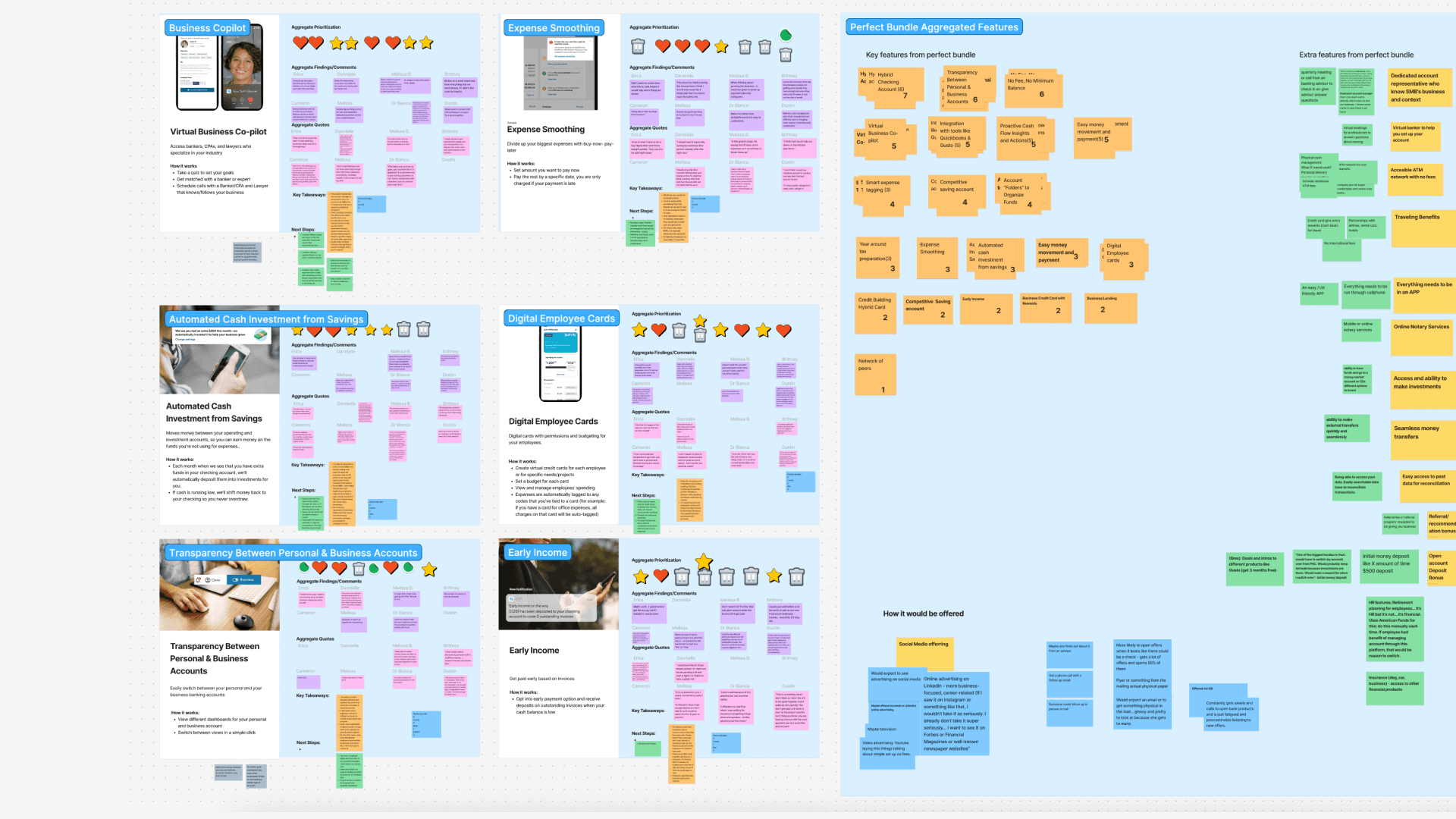 I sat down for the research team to organize the insights and ratings we gathered from user testing. The end result was a list of most loved features, expected features and liked features. Through research, we found that 80% of SMBs would open a business checking account that has no fee, no min balance, 0.5% cashback, 2% APY, with a $300 bonus. Small business deposits are >$1 trillion, lending TAM (balances) roughly $500B, CC annual spend $500B -$750B.