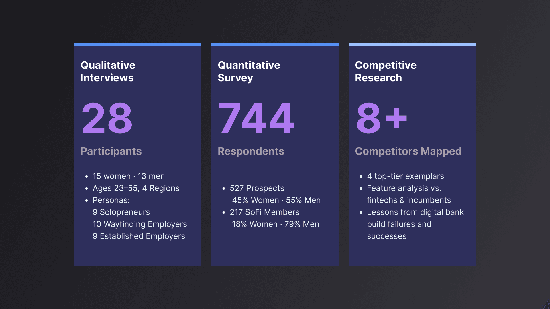 1. Validate early and often 6 weeks of rapid research (qual interviews, quant survey, and competitive analysis) helped compressed the discovery cycle. Testing sacrificial concepts early burned down the riskiest assumptions before any pixels were committed. 2. Design for the whole journey SMBs don't have a single need — they traverse 8 Jobs to Be Done. Designing across the solopreneur, wayfinding, and established employer journey simultaneously required a cohesive system. 3. Human + digital is the differentiator The biggest insight: SMBs need both digital convenience and human reassurance. Expert Team became the linchpin feature — making every other product feel safe to adopt. The prototype tested best when the banker relationship was front and center.