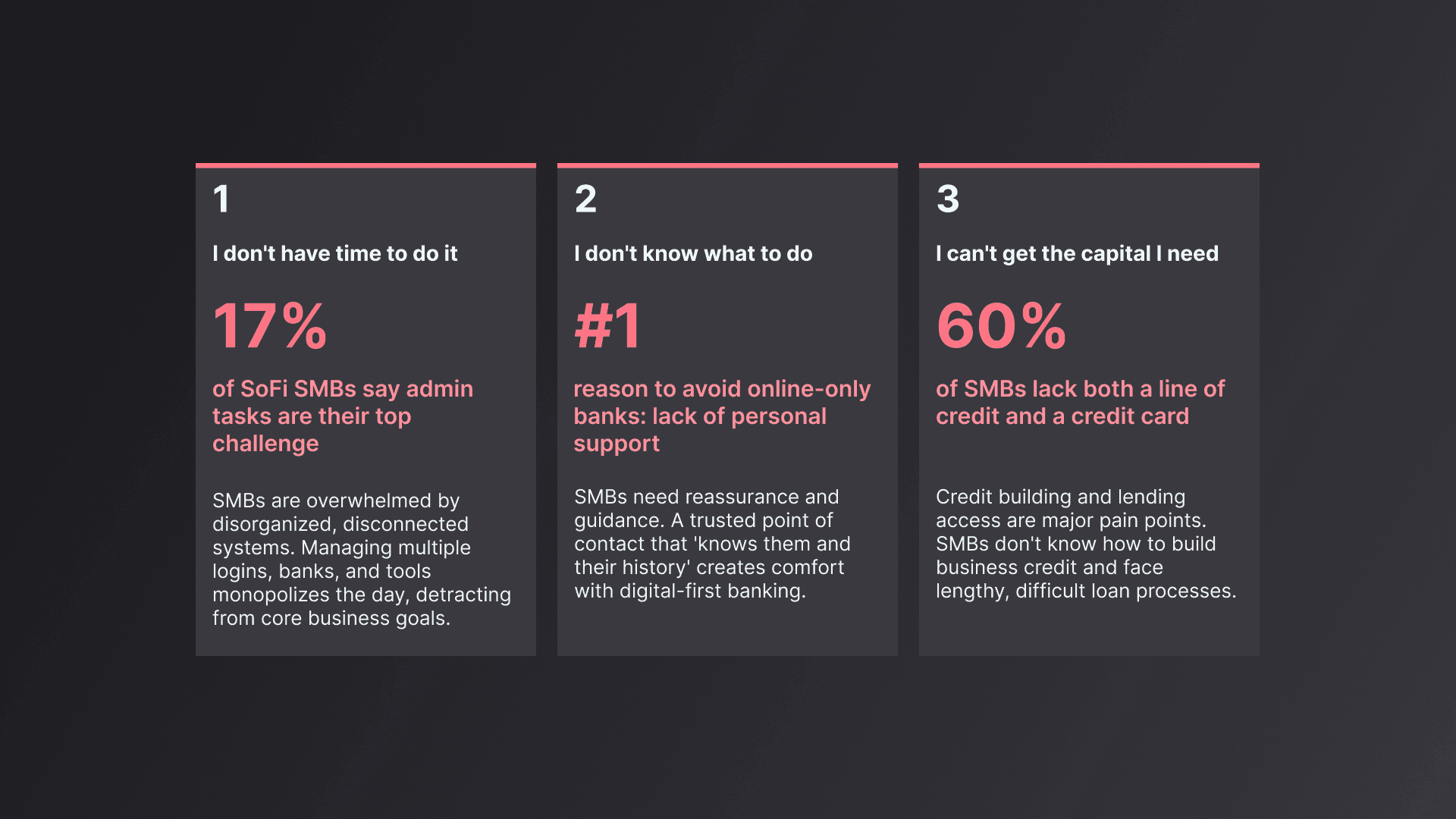Small to medium business owners (SMBs) are deeply underserved by both traditional banks and digital-first players. They are overwhelmed with existing disorganized systems and don't what to do. 17% of SoFi members spend too much time on admin tasks. They need to know that they are not alone. The top reason SMBs don’t want to switch is because of the support they already get from their local branch, but SMBs are dissatisfied with the basics they are receiving. How might we better serve SMBs needs throughout thier stages of entrepreneurial journey?