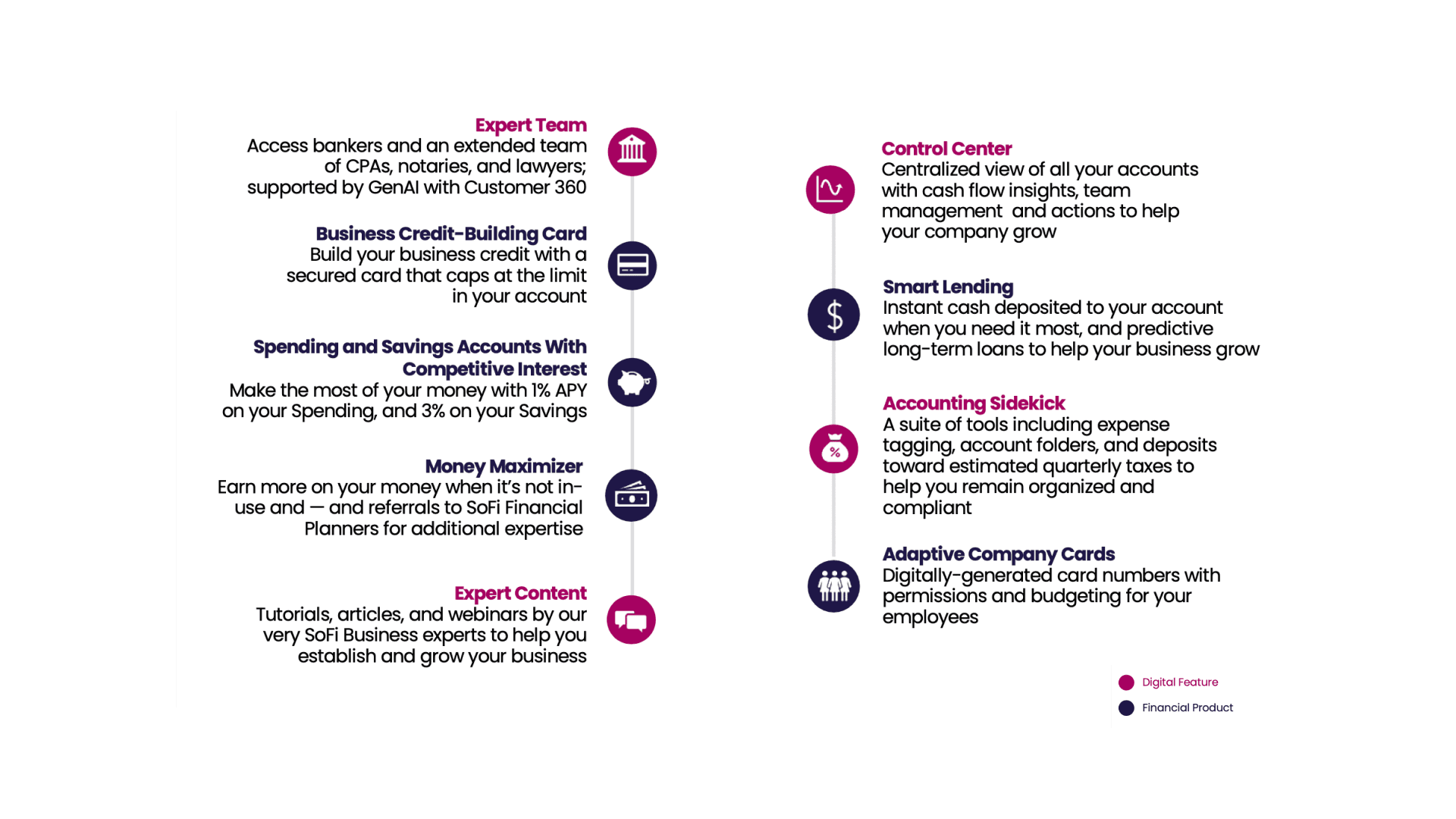 The Minimum Marketable Product (MMP) is the best-in-class small business banking and management tool by SoFi that helps business owners get started, grow, and maintain thier business with personalized content and expert access. This is solved by key market differential features including Expert Team, Expert Content, Control Center, Accounting Sidekick, Digital CFO, and Adaptive Company Cards. Financial products include Spending Account with Interest, Business Credit-Building Card, and Smart Lending.