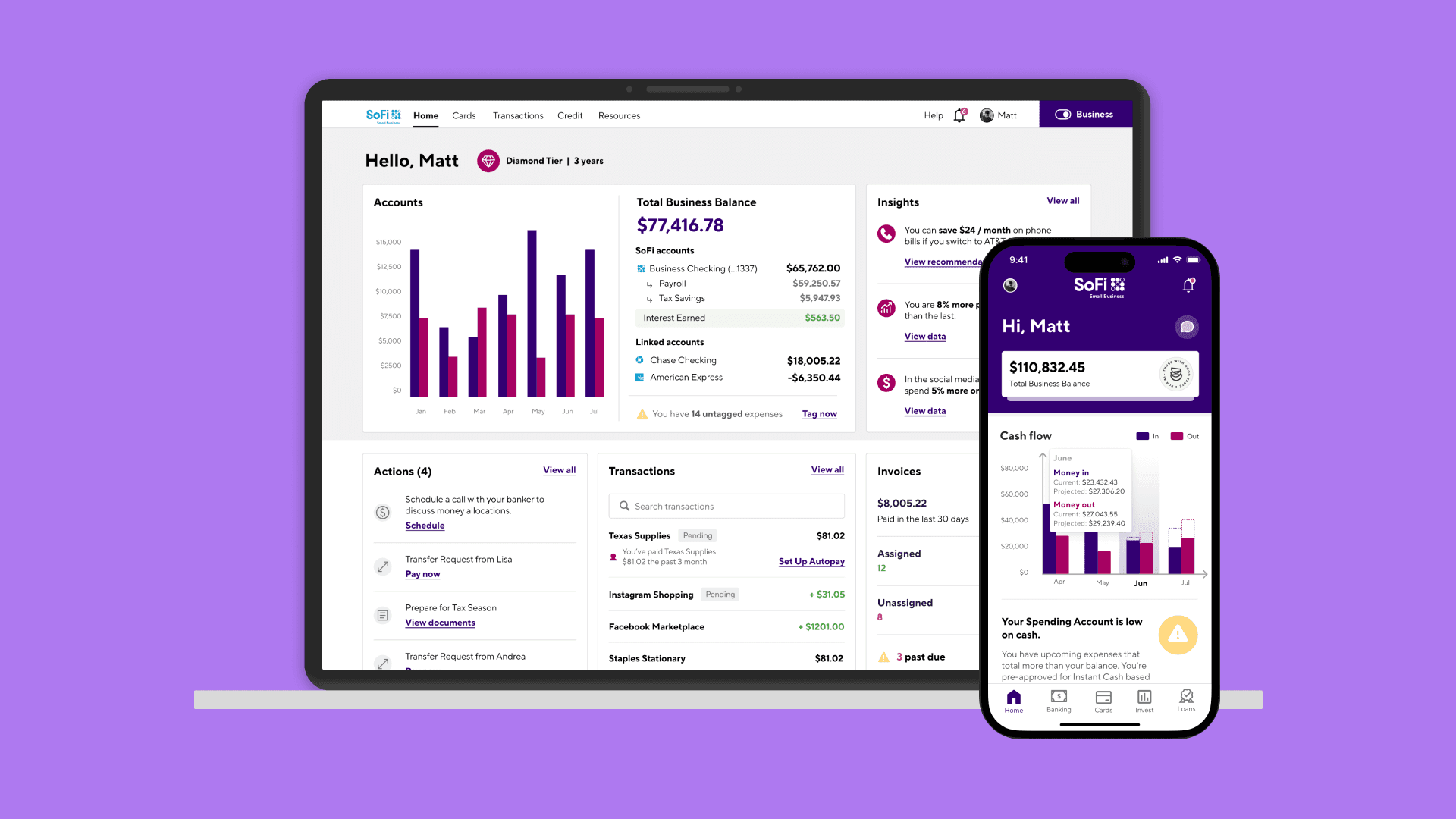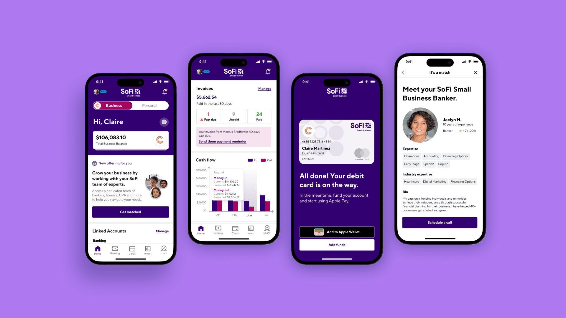 SMBs can get a centralized view of all their accounts. It syncs all business cards and loans in one place and integrates with accounting and HR softwares. Users can view business health — including Business Credit Score, cash in/out, invoice status, payroll/HR needs, and trends/projections with recommendations. The app also allows users to toggle between SoFi personal and all business accounts and easily transfer as needed.