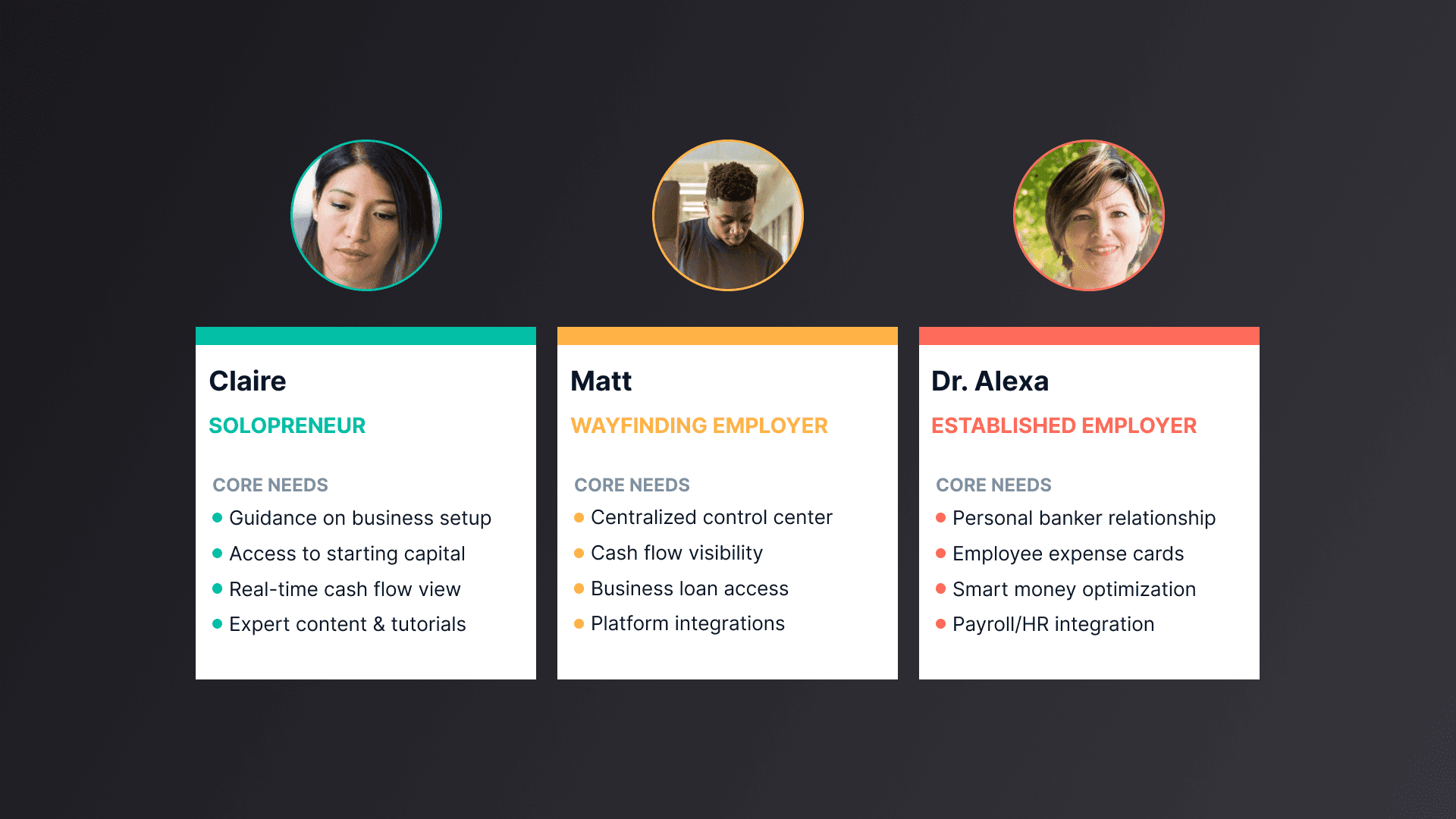 There were three burning needs that emerged across all personas. The insights found from research shows all three user types have existing concerns about Disorganization & Disconnected Systems, Relationship managers and online banking, as well as lacking credit support and loan access.