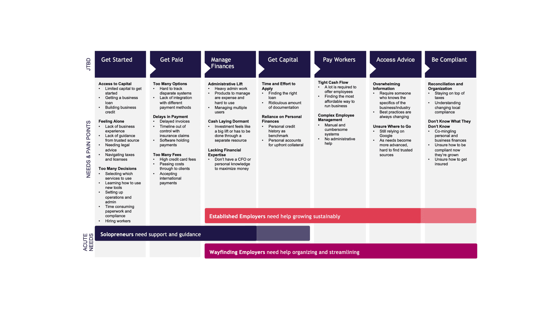 The journey of running a small business comes with many frictions, we mapped out all three user types on a single journey map. All three user types have overlapping concerns during managing finances and getting capital.